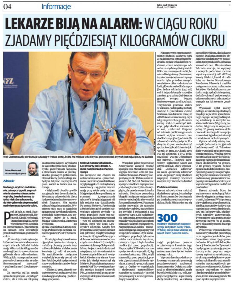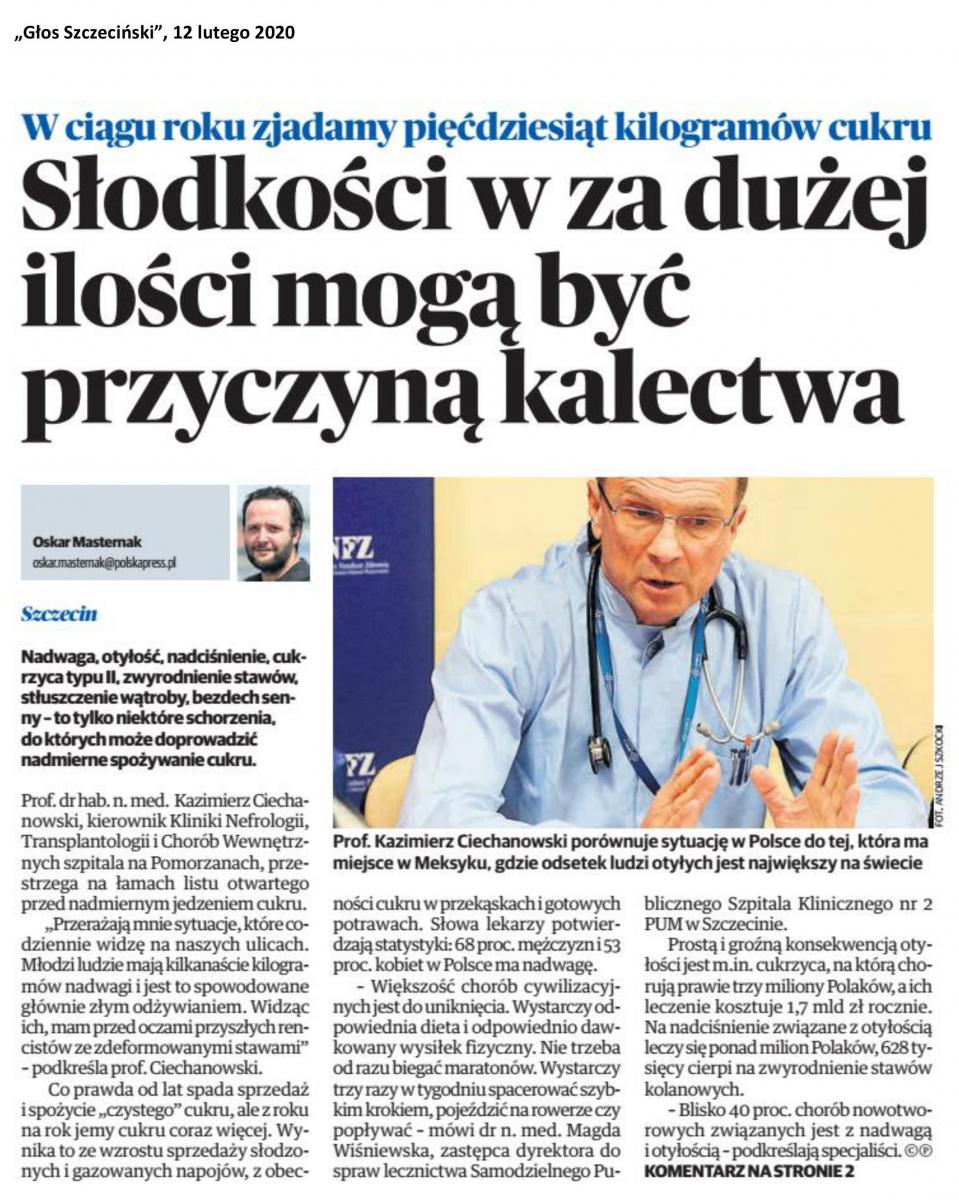 2020-02-12W związku z ogólnopolską kampanią Narodowego Funduszu Zdrowia dotyczącą szkodliwości nadmiaru cukru w diecie Polaków stanowisko w tej sprawie zajął prof. dr hab. n. med. Kazimierz Ciechanowski – specjalista chorób wewnętrznych, diabetologii, nefrologii, transplantologii klinicznej oraz medycyny sportowej, lekarz kierujący Kliniką Nefrologii, Transplantologii i Chorób Wewnętrznych naszego szpitala.