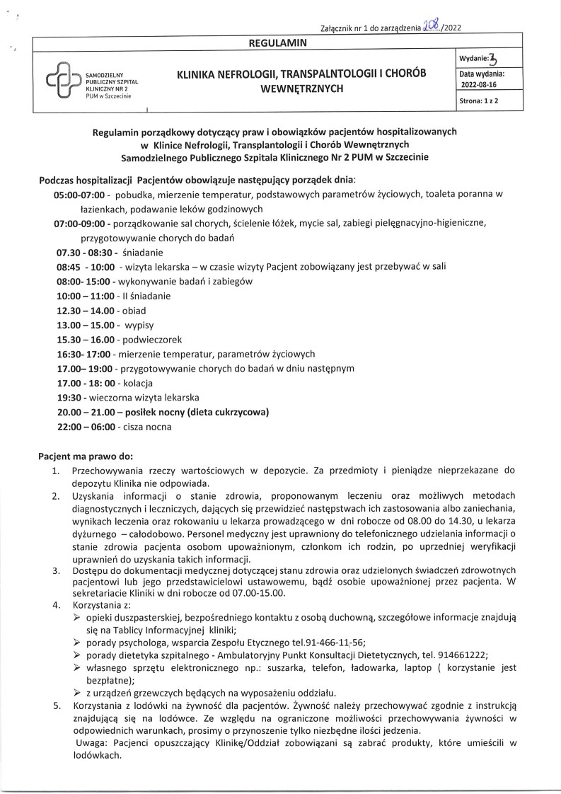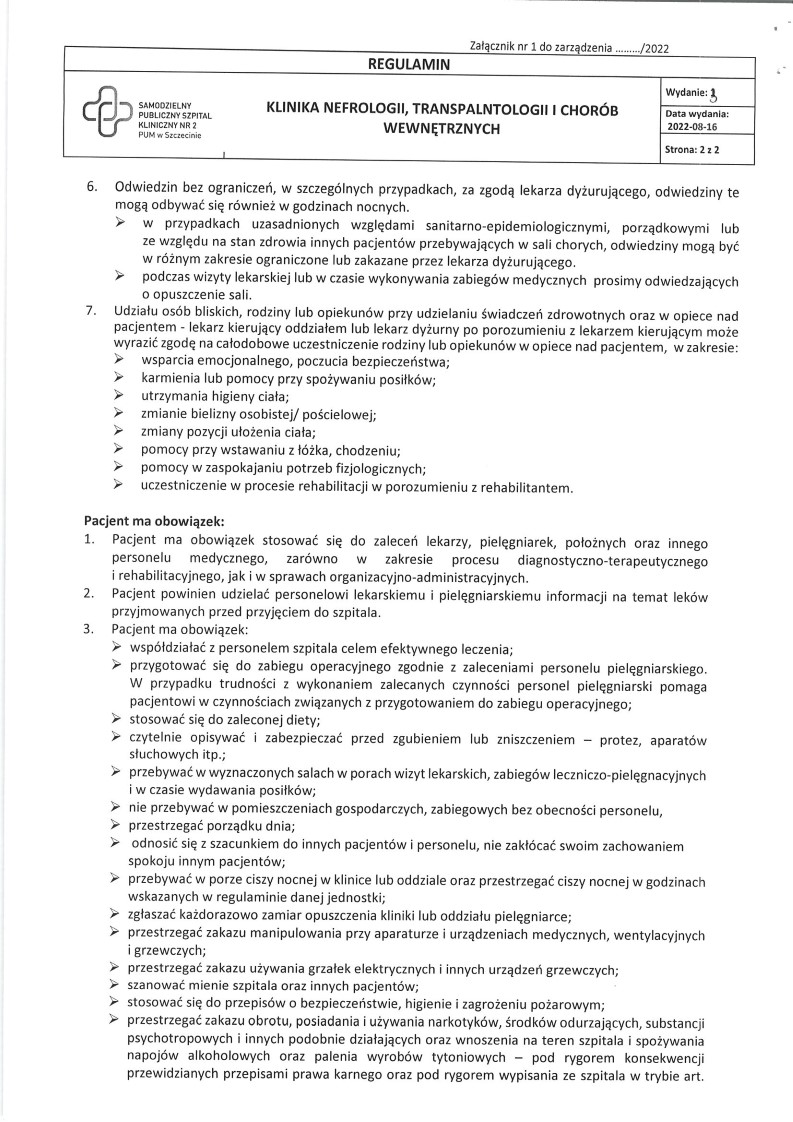 Pacjent do planowego przyjęcia powinien zgłosić się na czczo we wskazanym dniu na Izbę Przyjęć Kliniki Nefrologii, Transplantologii i Chorób Wewnętrznych (bud. K) w godzinach porannych. Należy wziąć ze sobą: dowód osobisty, skierowanie od lekarza, całą posiadaną dokumentację medyczną (wcześniejsze wypisy z hospitalizacji, dokumenty potwierdzające wykonanie badań obrazowych - USG, tomografie) oraz pełną listą aktualnie przyjmowanych leków z planem ich zażywania.