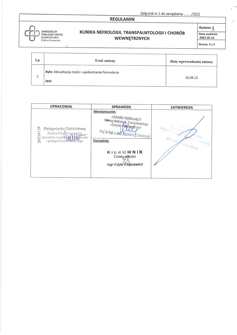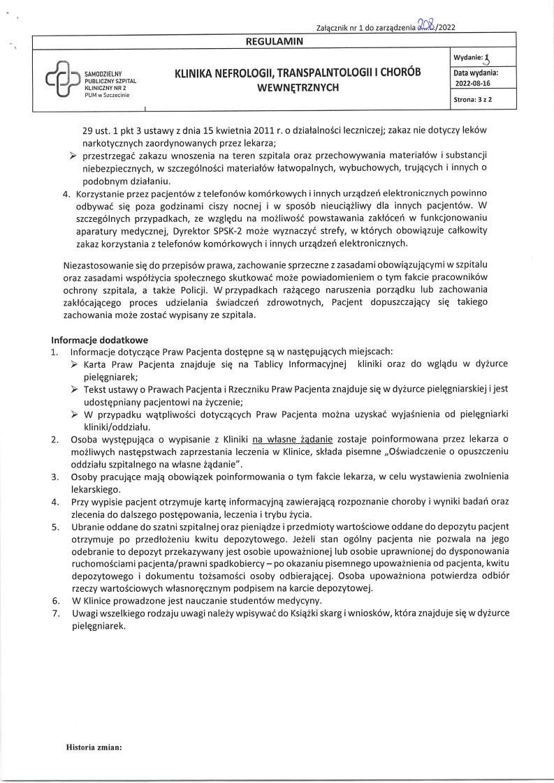 Jeżeli podczas pobytu w Klinice została wykonana biopsja nerki lub zostały pobrane badania histopatologiczne (kolonoskopia, gastroskopia), wyniki będą do odebrania w sekretariacie Kliniki (bud. K, piętro I) za około 3 tygodnie od dnia wykonanego badania.